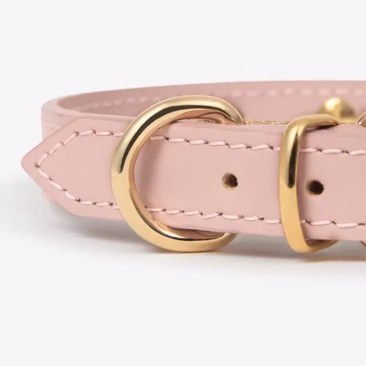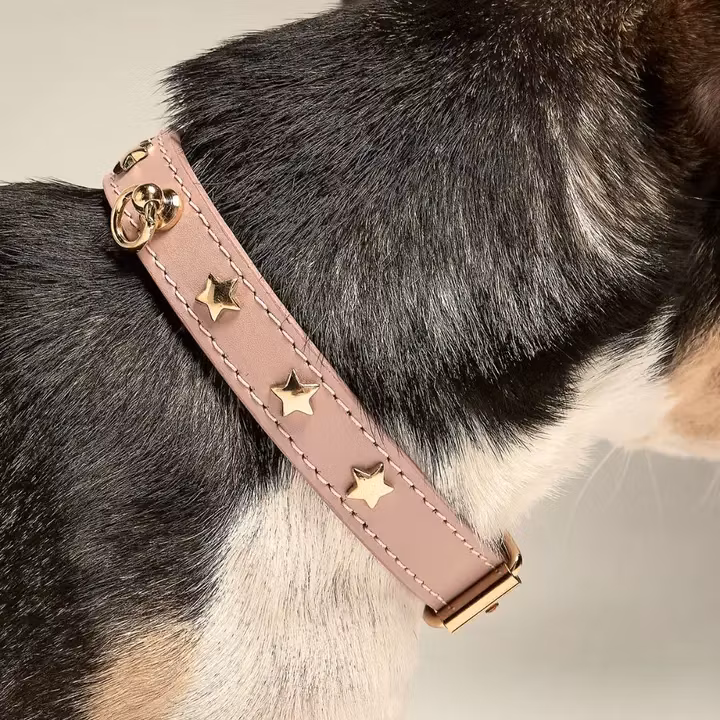 Halsbandet är tillverkat i Milano i 100% italienskt läder och i detta utförande i ett slätt färgat läder med sömmar i matchande färg och med guldfärgade stjärnformade nitar. Finns i olika utföranden.