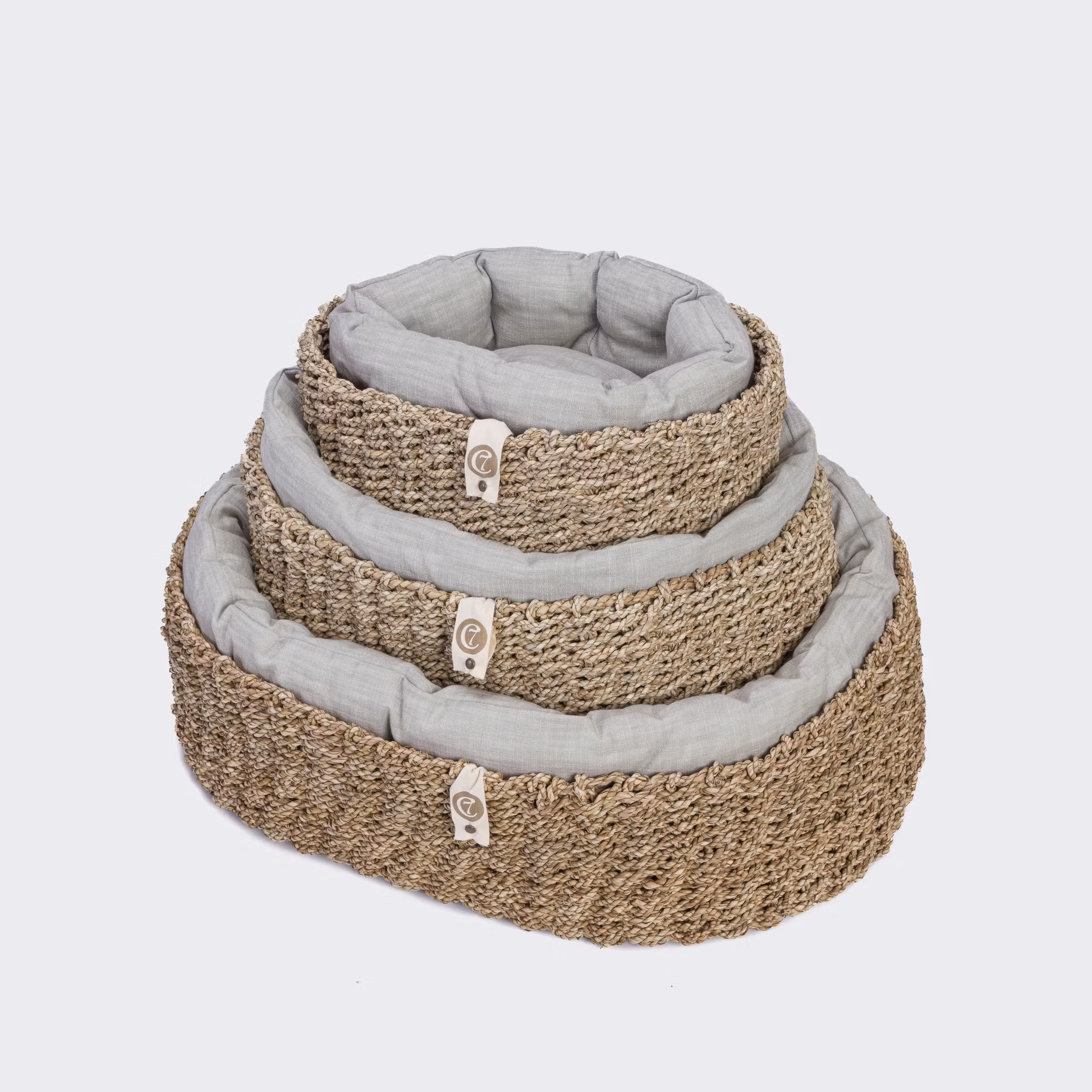 Hundkorg i en elegant minimalistisk design som passar in i alla hem! Tillverkad för hand i flätad sjögräs med en vadderad bädd i bomullsmix. Den flätade sjögräsen ger en mjuk stadga till bädden och gör det till en mycket bekväm plats att vila på. Perfekt för hundar som tycker om att kurra ihop sig när de sover.